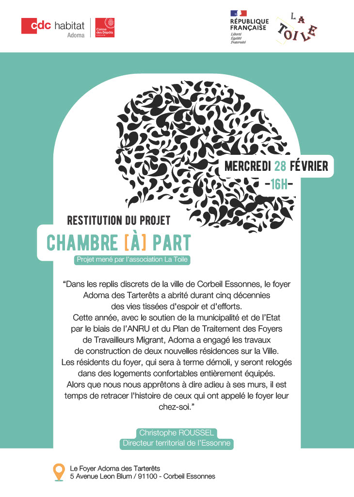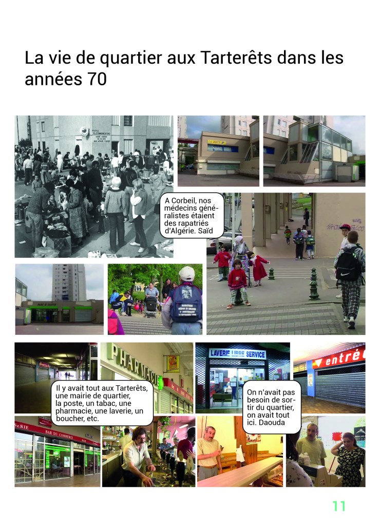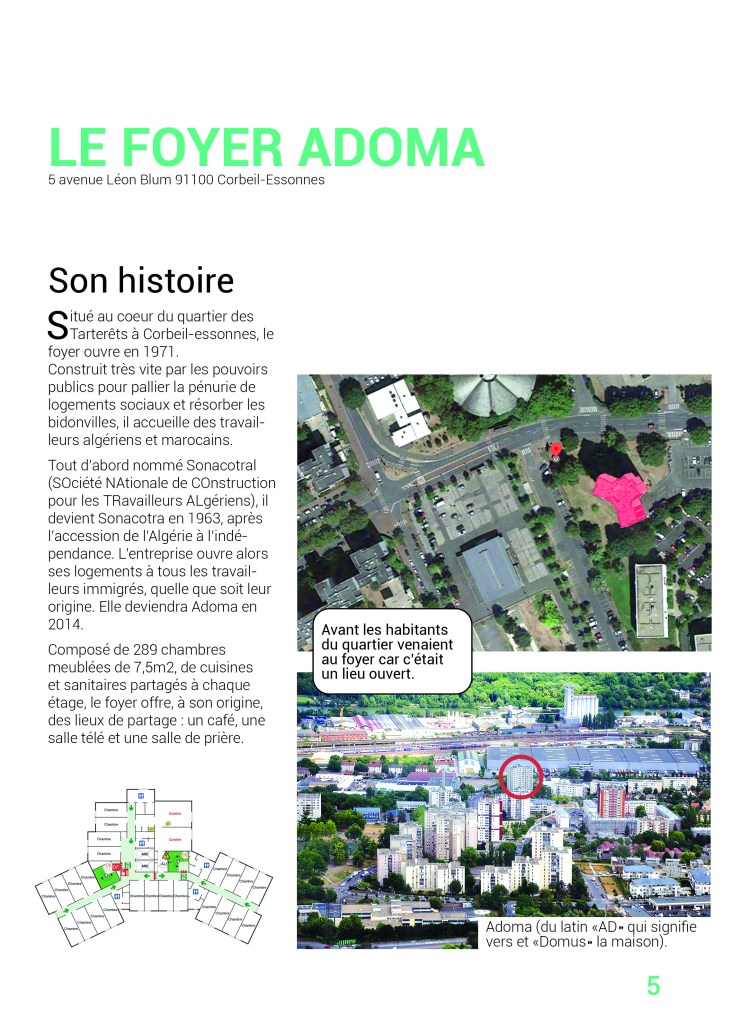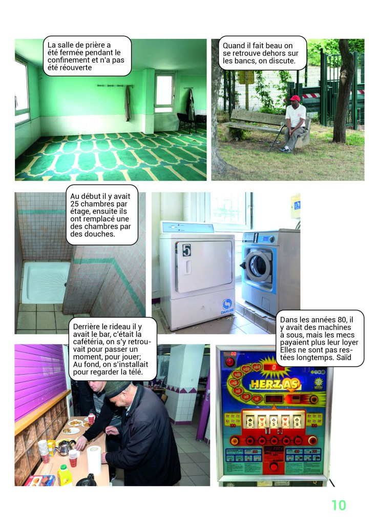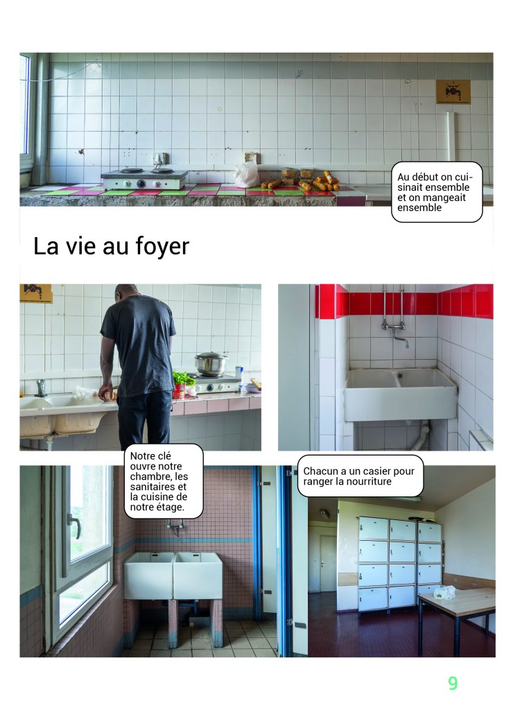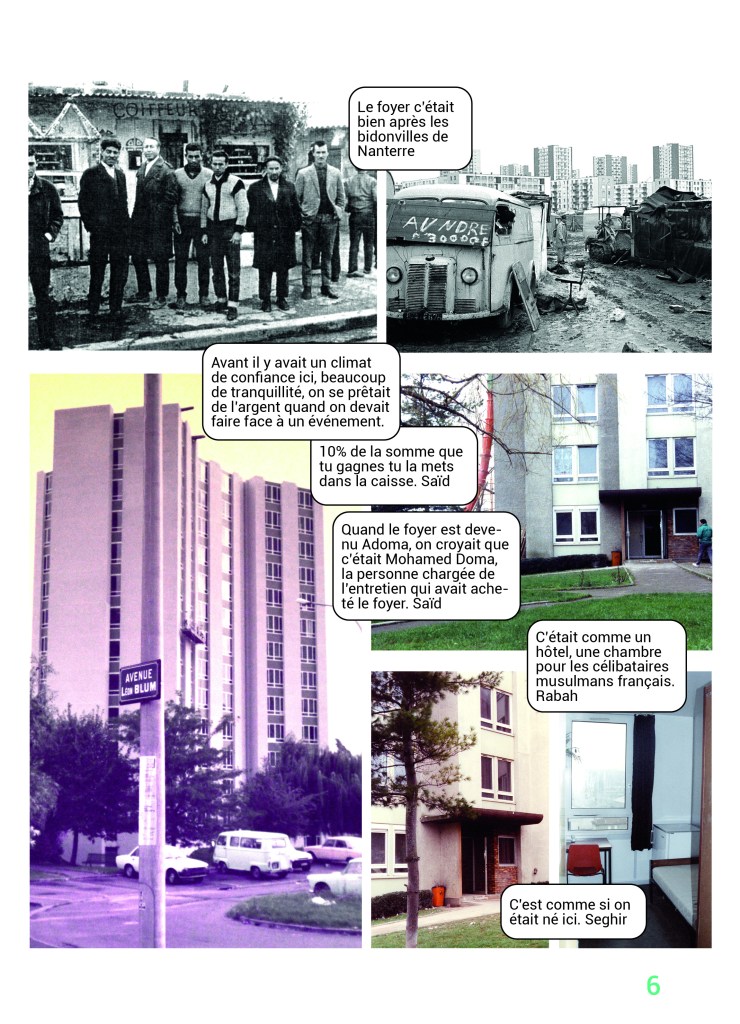 Pendant plusieurs mois nous avons rencontré les résidents du foyer Adoma (anciennement Sonacotral), nous avons recueilli leurs témoignages. Les plus anciens dits chibanis, sont essentiellement originaires de la région de Bordj Bou Arreridj en Algérie et certains d’entre eux occupent une chambre du foyer depuis son ouverture en 1971. Il nous a semblé important de restituer leur vécu dans le quartier des Tarterêts alors que le foyer allait être démoli. C’est sous la forme d’un roman-photo que nous avons retracé leurs vies de travailleurs migrants, leurs histoires familiales, leurs façons d’occuper le territoire, etc. Aux récits de leurs migrations, nous avons ajouté ceux des résidents qui sont arrivés d’Afrique subsaharienne dans les années 80-90 pour des raisons économiques, puis ceux des réfugiés politiques à partir des années 2000. Lors de la restitution, de la présentation de notre publication, nous avons exposé des installations évocatrices de leurs parcours et de leurs espoirs fondés en l’exil : forme de mood board en 3 dimensions composé de tissus, de vêtements, d’objets personnels, de cartes, etc. Pour mettre des mots et des images sur des ressentis, nous avons aussi fait dialoguer des citations avec des œuvres d’art engagées.
