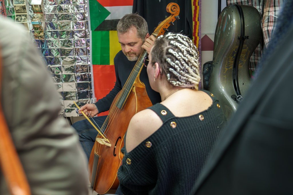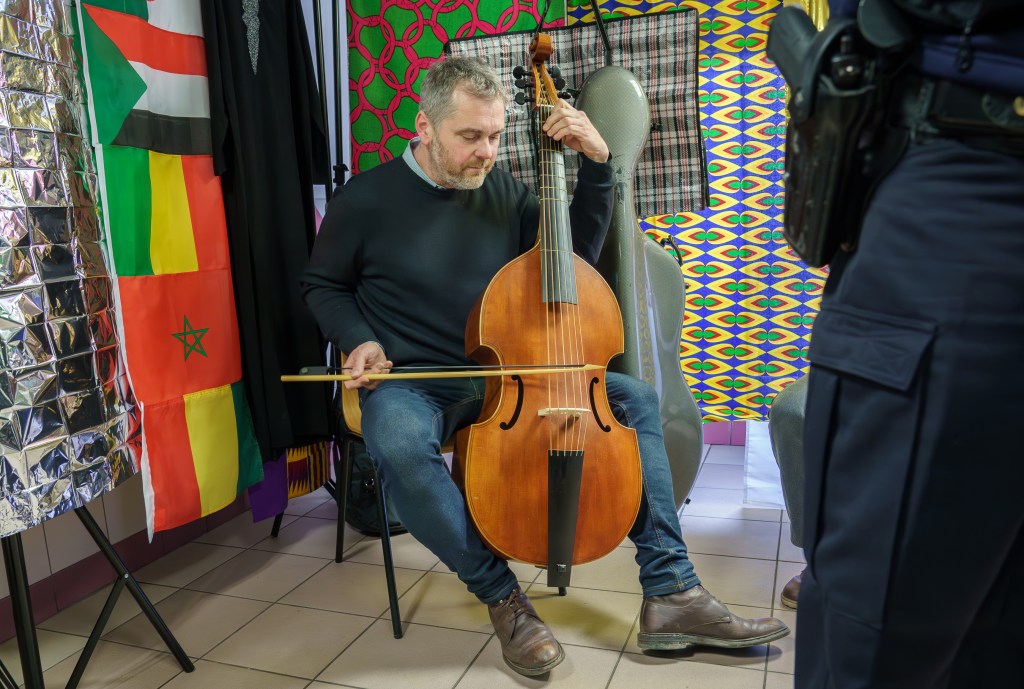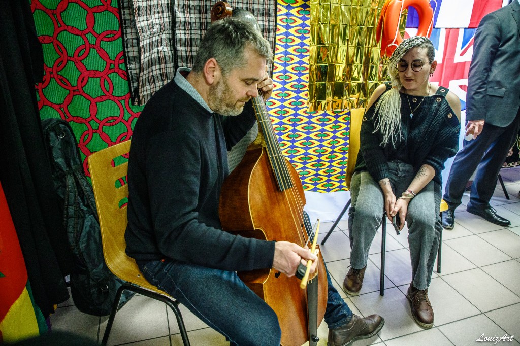 Nous avons découvert Baptiste lors d’un spectacle du Grand Bi donné à la Maison de quartier des Tarterêts avec Mathieu Marinach. Nous l’avons ensuite invité à plusieurs reprises pour accompagner des habitants lors de scènes ouvertes, pour l’inauguration de l’exposition Chambre [à] part au foyer Adoma et la performance culinaire à l’Hôtel de ville de Corbeil-Essonnes. Lors de la restitution au foyer Adoma, Baptiste était accompagné par Mylène Rohart au chant.