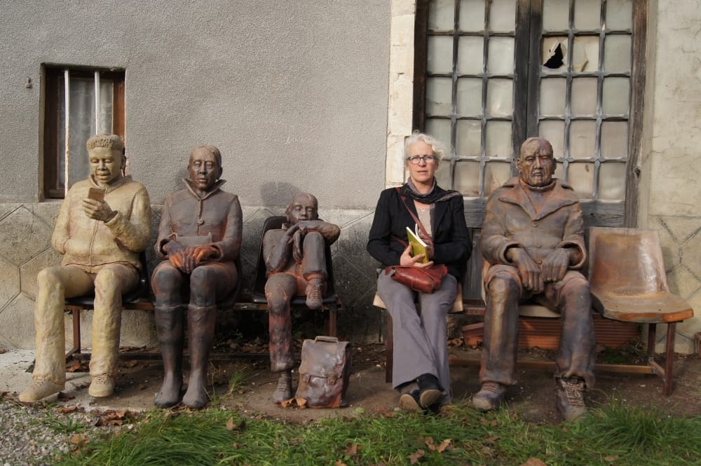 Certaines œuvres sont grandeur nature comme les personnages assis de la série : « Les lieux de déserts de l’âme », ci-contre. C’est un moment d’attente, de pause, d’abandon au cours du voyage. Les corps sont relâchés, l’esprit absent. On y ressent aussi de la solitude : les gens sont isolés malgré leur promiscuité physique. Elle parle de notre temps social, des temps dit « morts » qui font aussi partie de notre quotidien et nous ressourcent peut être. Les « regardeurs » presque toujours, entrent dans la sculpture pour une photographie. Le siège libre les y invite. https://www.lauregaudebert-sculptures.com/