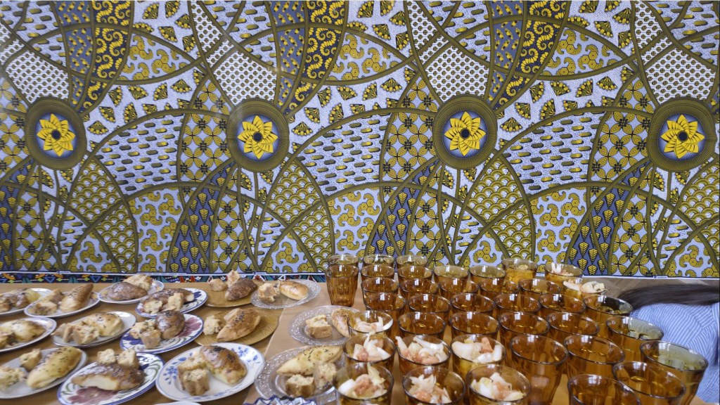 Dès l’entrée, les visiteurs se sont vus confier des expressions en rapport avec la nourriture à l’oreille avant d’être conduits à leur table, table dressée de façon à faire l’éloge de la diversité culturelle.